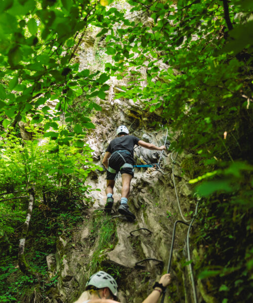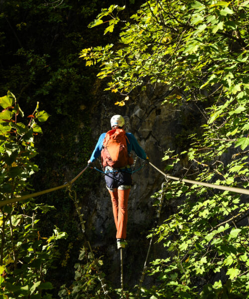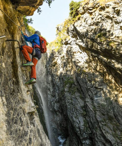 Mit Helm und Klettergurt ausgestattet begeben Sie sich auf den ersten Klettersteig im Wallis. Der Via Farinetta führt Sie über die senkrechten Felswände der Salentse-Schlucht. Die Route ist in drei Abschnitte mit steigendem Schwierigkeitsgrad unterteilt. Nach jedem Abschnitt kann man den Klettersteig verlassen, wobei der letzte Abschnitt erfahrenen Kletterern vorbehalten ist.