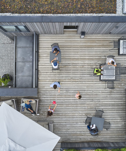 Le petit plus : l’immense terrasse meublée d’un espace détent avec chaises confortables, coussins, parasols et équipée d’un four à pizza, d’une plancha et de lumières d’ambiance.